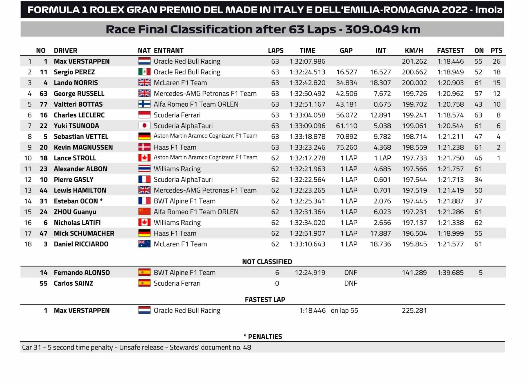 Les résultats définitifs du GP d’Emilie-Romagne 2022