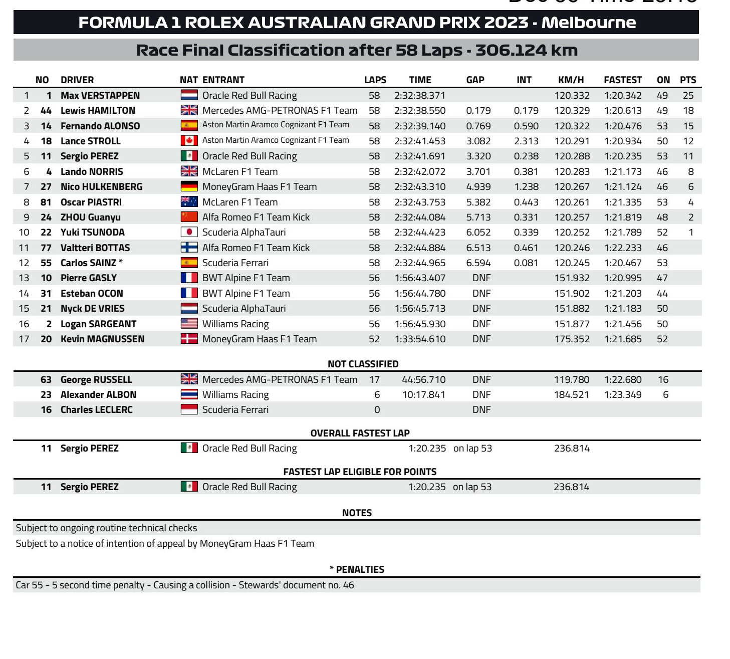 Meilleur tour en course : c’est le pilote Red Bull Sergio Perez qui a signé le meilleur tour en course à Melbourne et qui empoche donc le point bonus. Le Mexicain a signé un 1,20.235 au 53e tour.