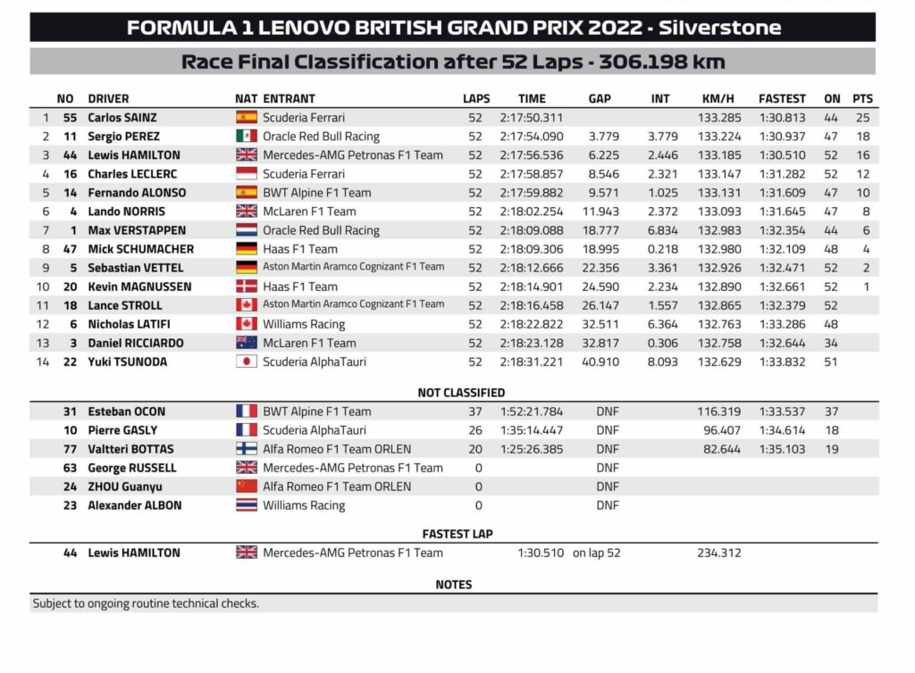 Les résultats définitifs du GP F1 de Grande-Bretagne 2022