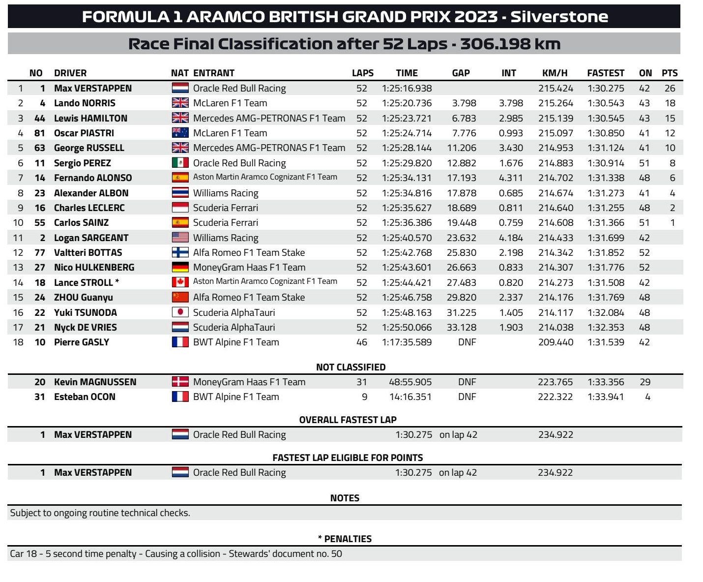 Résultats définitifs du GP de Grande-Bretagne 2023