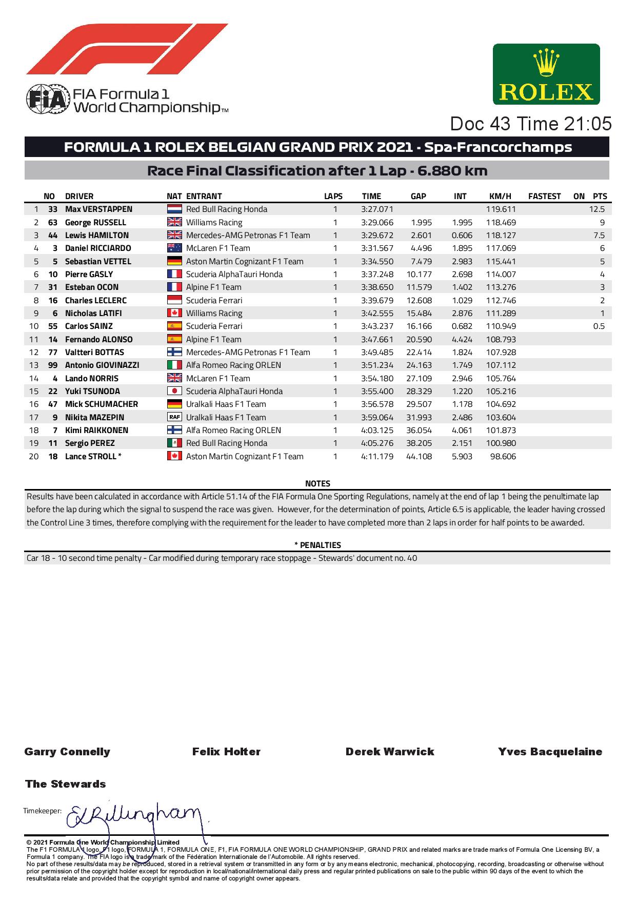 A 18h17 donc, le départ du Grand Prix de Belgique a été donné par la direction de course, mais là encore, les pilotes ont dû se contenter de rester sagement derrière la voiture de sécurité durant deux tours avant que la course soit finalement stoppée définitivement par la FIA. Le résultat final a ensuite été annoncé et la cérémonie du podium a bien eu lieu.
