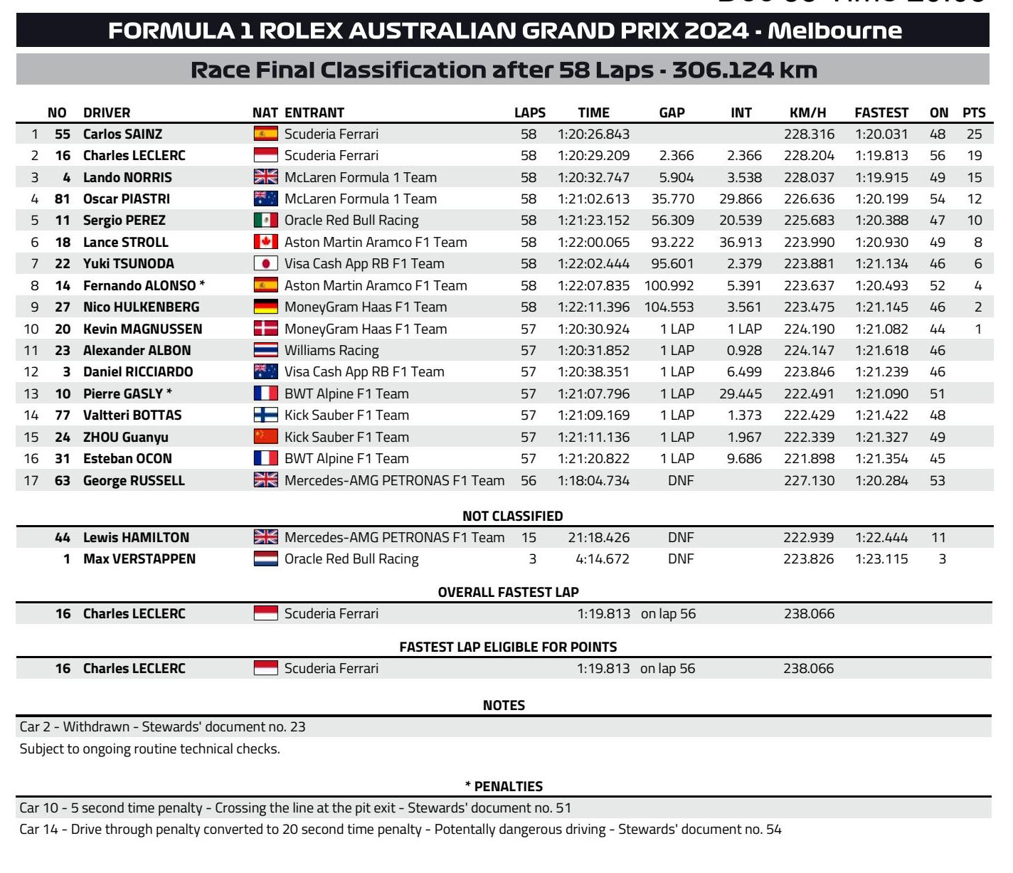 Derrière, Oscar Piastri, Sergio Perez, Lance Stroll, Yuki Tsunoda, Fernando Alonso, Nico Hülkenberg et Kevin Magnussen complètent le top dix à l’arrivée de cette troisième manche de la saison 2024 marquée par l’abandon du leader du championnat Max Verstappen et ceux du septuple champion du monde Lewis Hamilton et de son coéquipier George Russell.