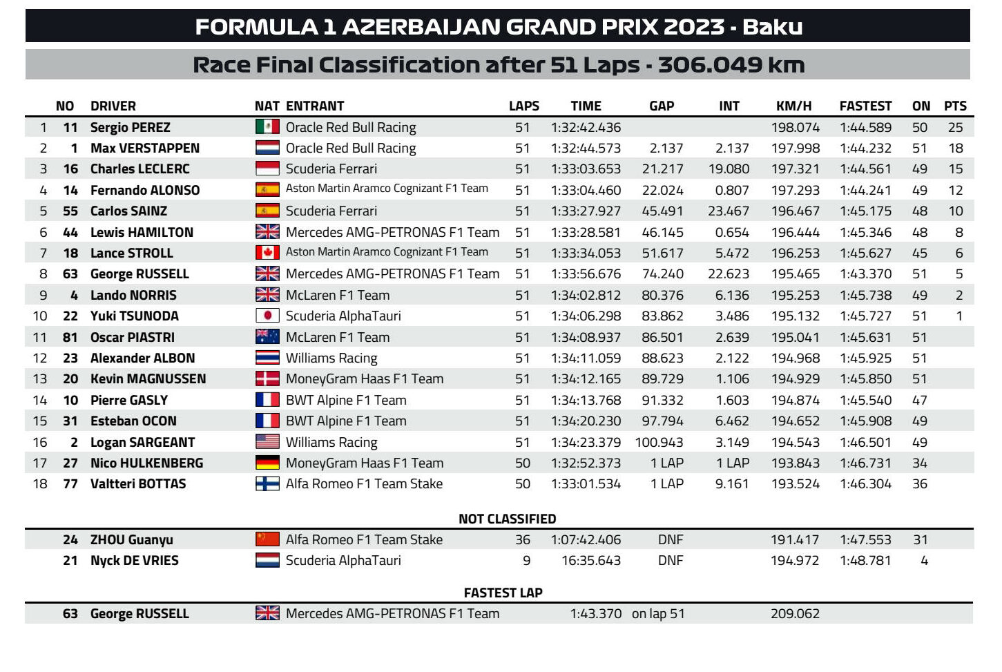 Les résultats définitifs du Grand Prix F1 d’Azerbaïdjan 2023