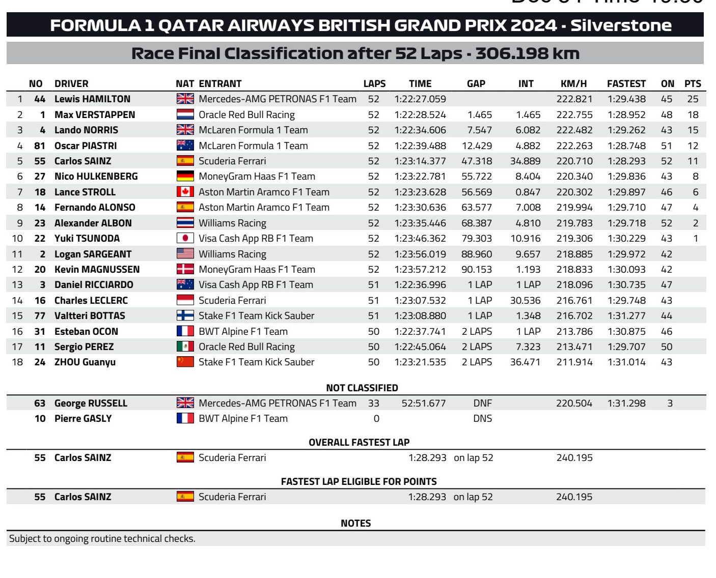 Résultats définitifs du GP de Grande-Bretagne 2024