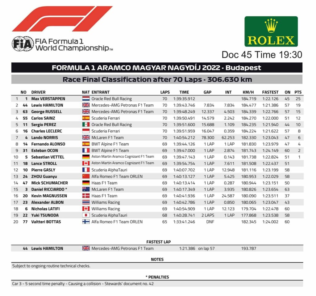 Voici les résultats officiels et définitifs du Grand Prix de Hongrie 2022 disputé ce dimanche 31 juillet sur le tracé du Hungaroring de Budapest.