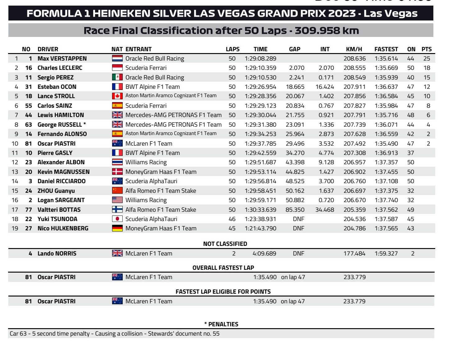 Les pénalités : il y a eu deux pénalités en course au Grand Prix de Las Vegas. Le pilote Red Bull Max Verstappen a reçu une pénalité de cinq secondes en course pour avoir forcé le pilote Ferrari Charles Leclerc à quitter la piste au départ. Le Néerlandais a également écopé de deux points de pénalité sur sa superlicence.
