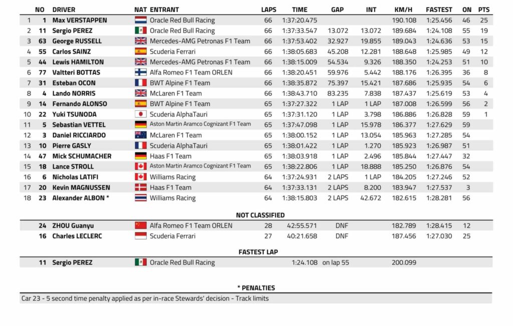 Meilleur tour en course : c’est le pilote Red Bull Sergio Perez qui a signé le meilleur tour en course ce dimanche en Espagne et qui empoche donc le point bonus. Le Mexicain a signé un 1,24.108 au 55e tour de course.