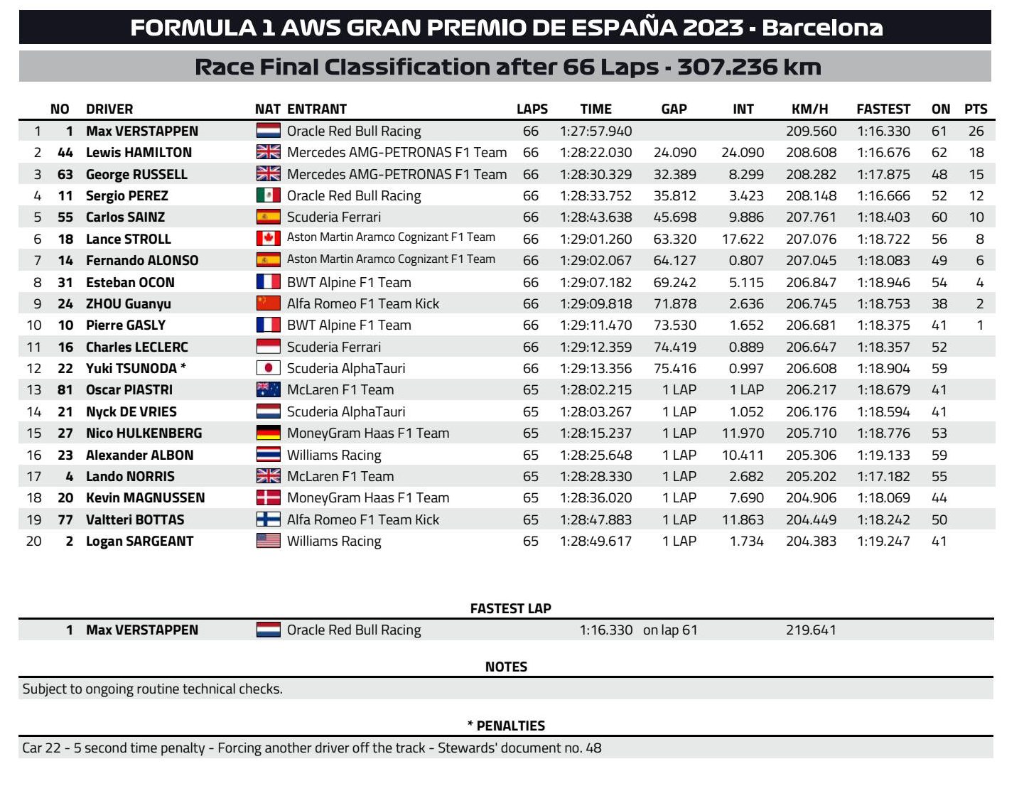 Les résultats du GP d’Espagne 2023