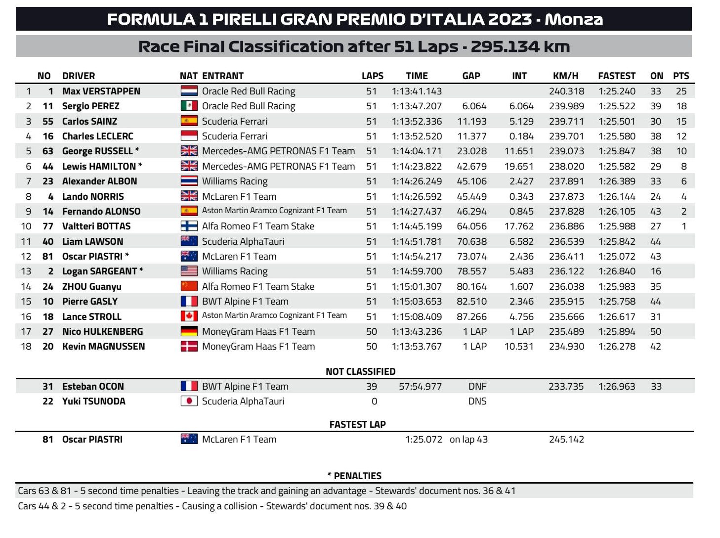 Les résultats définitifs du Grand Prix F1 d’Italie 2023
