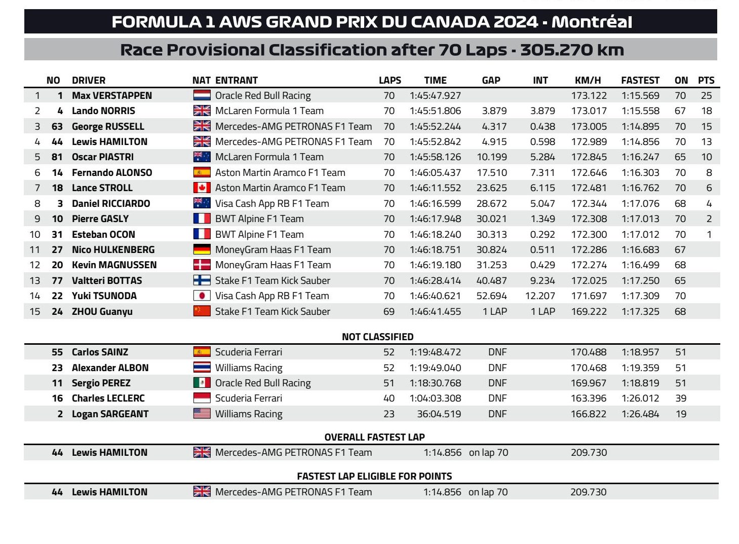 Les résultats définitifs du Grand Prix F1 du Canada 2024