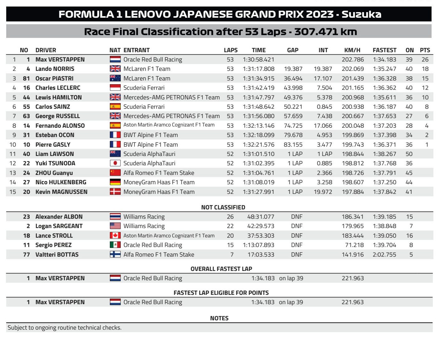 Les résultats définitifs du Grand Prix F1 du Japon 2023