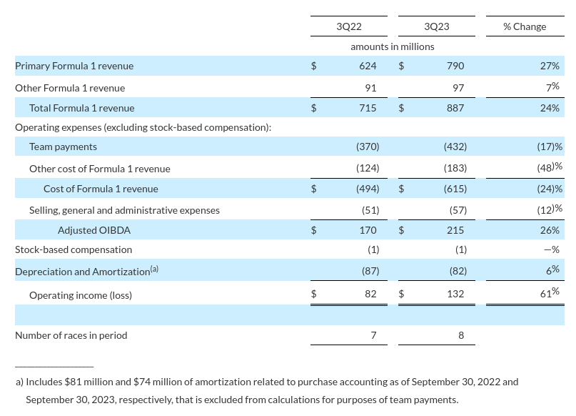Les autres revenus de la F1 ont augmenté au troisième trimestre, principalement en raison de la hausse des revenus du fret due à deux courses supplémentaires organisées en dehors de l’Europe et de la hausse des revenus liés à l’accueil dans le Paddock Club.