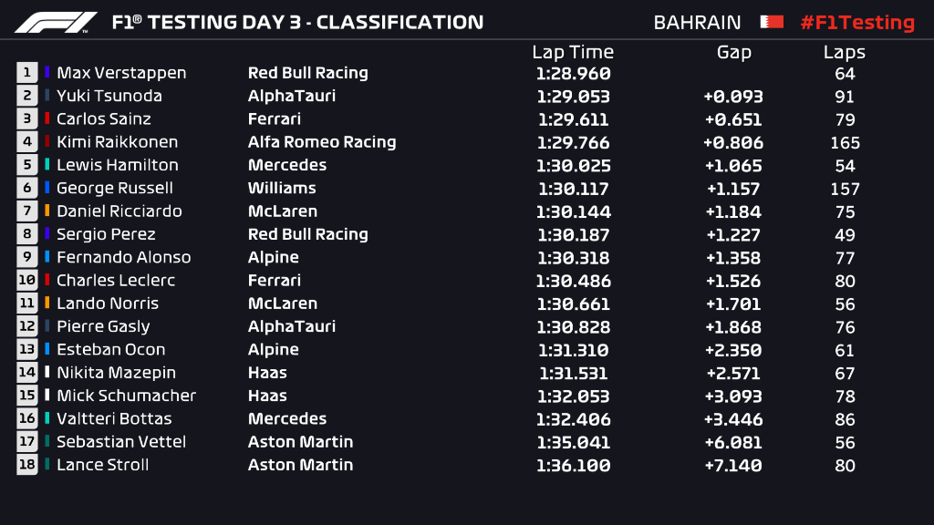 Lewis Hamilton pour sa part a terminé la dernière journée à la cinquième position avec plus d’une seconde de retard sur la Red Bull de Max Verstappen.