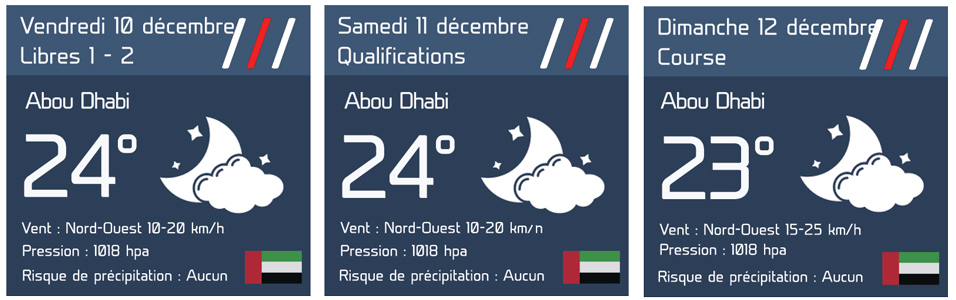 Comme anticipé et sans grande surprise, les conditions météo seront stables et sèches tout au long de ces trois jours pour cet ultime rendez-vous de l’année. En revanche, comme les qualifications et la course débuteront 30 minutes avant le coucher du soleil, la température de la piste sera en constante évolution. Les pneumatiques les plus tendres mis à disposition par Pirelli (C3, C4 et C5) offriront donc un choix varié aux écuries ce qui pourrait devenir un élément stratégique déterminant pour décrocher la pôle samedi et éventuellement la victoire dimanche.