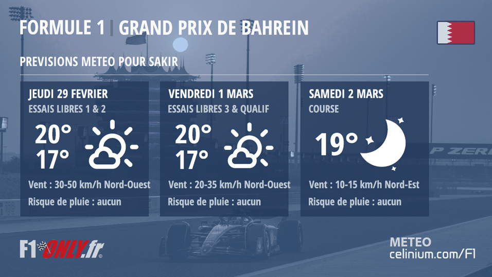 Avec un calendrier record comprenant 24 courses, la saison de F1 2024 débute ce week-end à Bahreïn. Comme pour les saisons précédentes, F1only est mobilisé pour vous tenir informés des conditions atmosphériques pour chaque Grand-Prix en publiant un bulletin météo complet avant chaque week-end de course. Pour cette manche inaugurale, direction le circuit international de Sakhir.