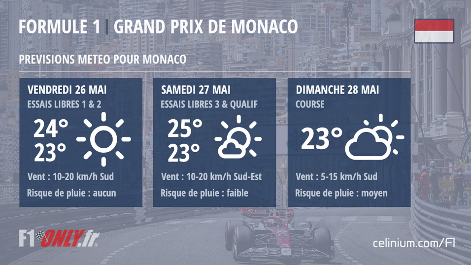 Tout au long des 78 tours que comporte l’épreuve monégasque, l’instabilité se confirme et pourrait éventuellement engendrer des orages en fin de journée. Le risque de précipitations pendant la course est encore incertain au moment où ce bulletin météo est rédigé mais si jamais la pluie venait à être confirmée, une mise à jour de cet article sera mise en ligne.