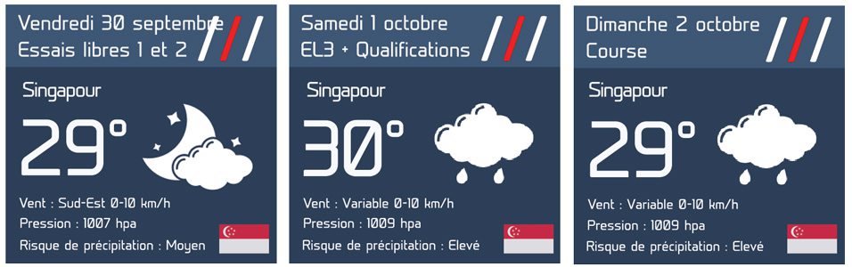 Pour obtenir les prévisions heure par heure (mise à jour deux fois par heure) pour le Grand Prix de Singapour, vous pouvez consulter le site de notre partenaire météo Celinium en cliquant sur ce lien: Celinium.