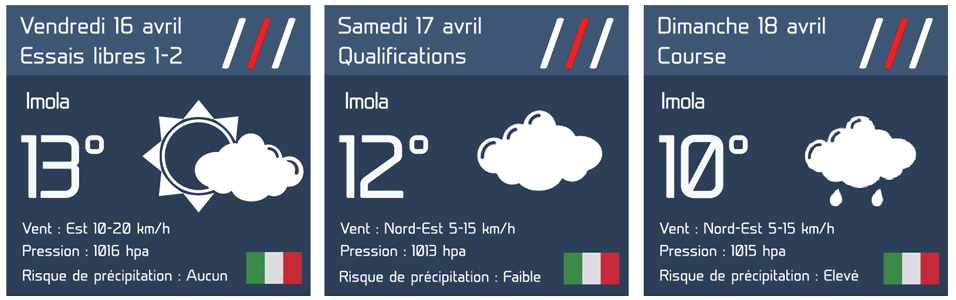 La journée de vendredi débutera avec une alternance de soleil et de passage nuageux dans la région de Bologne. Les conditions sèches et fraiches (il fera 5°C au lever du soleil) seront remplacées par un temps de plus en plus nuageux lors des deux premières séances d’essais libres.