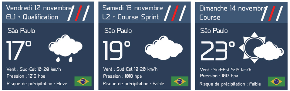 Vous pouvez retrouver les prévisions heure par heure (actualisées toutes les 10 minutes) pour le Grand Prix du Brésil, en consultant le site de notre partenaire météo Celinium en cliquant sur ce lien: Celinium.