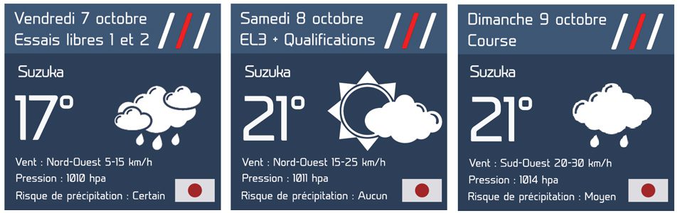 Pour suivre l’évolution de la météo en temps réel durant tout le week-end du Grand Prix du Japon, vous pouvez consulter les toute dernières prévisions sur le site de notre partenaire Celinium en cliquant sur ce lien.