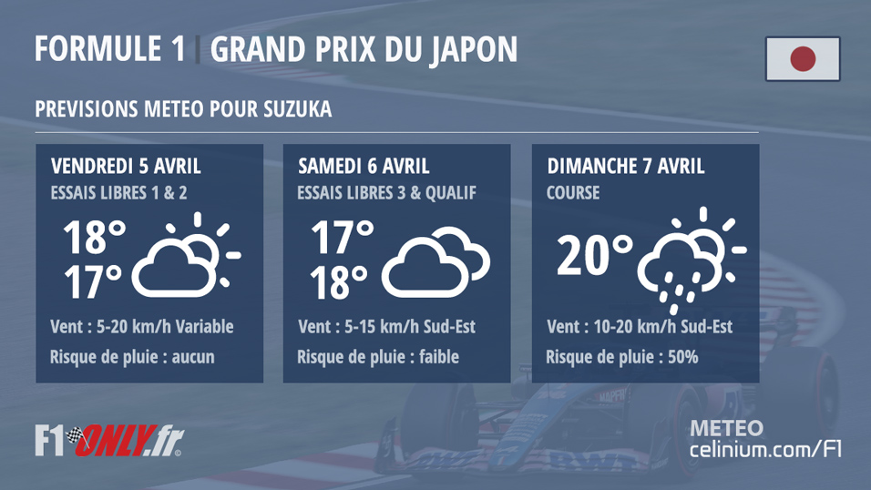 Compte tenu de la situation actuelle et pour rester informé de l’évolution des prévisions météo durant tout le week-end du Grand Prix du Japon, vous pouvez consulter le site météo de notre partenaire Celinium en cliquant sur ce lien.