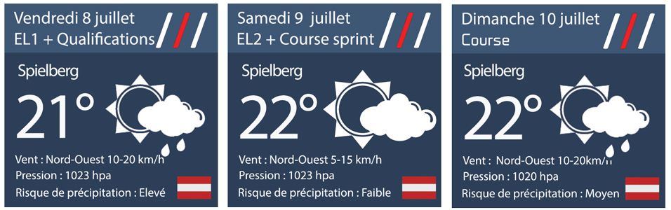 A l’heure où est rédigé ce bulletin météo, tout indique que la course de dimanche devrait se dérouler sous un ciel encore nuageux avec un petit risque d’une ou deux averses isolées. De par le relief du site, les averses venant de l’Ouest ou du Nord-Ouest ont souvent tendance à se dissiper au-dessus du tracé de Spielberg. La température approchera 22°C au moment de l’extinction des feux rouges et le vent modéré du Nord-Ouest soufflera tout au long des 71 tours.