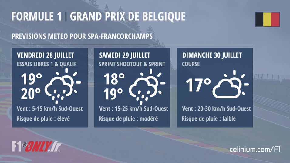 Ce week-end, la F1 met le cap sur la Belgique pour y disputer la dernière course avant la trêve estivale. Pour pimenter ce Grand Prix, qui sera aussi sous format Sprint, la météo s’annonce arrosée surtout pour vendredi et samedi. Voici les prévisions détaillées pour le Grand Prix de Belgique 2023.