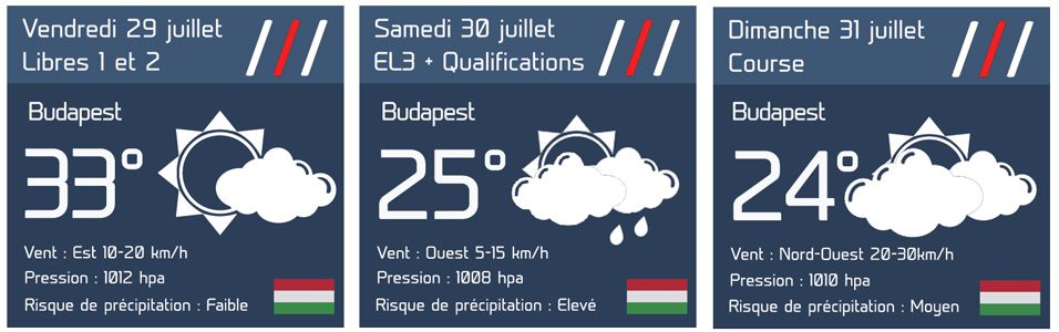La fournaise hongroise portera bien son nom vendredi car c’est un temps très chaud (33°C) qui attend les pilotes pour les deux premières séances d’essais libres disputées en après-midi. Côté ciel, il faudra composer avec un temps nuageux. Le vent d’Est est modéré et souffle entre 10 et 20 Km/h. Le ciel se couvrira en fin de journée annonçant la dégradation pluvio-orageuse.