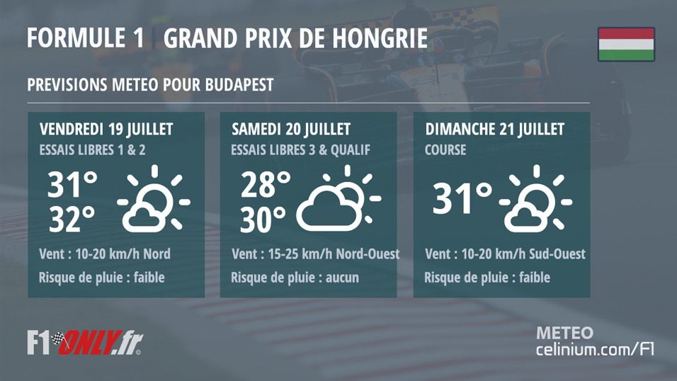 Au moment du départ de l’épreuve, le thermomètre affichera 31°C. Une légère brise de sud-ouest, soufflant entre 10 et 20 km/h, accompagnera les monoplaces tout au long de l’épreuve. Cependant, le tarmac hongrois devrait une nouvelle fois atteindre des températures élevées, frôlant les 50°C, ce qui promet une course éprouvante pour les pilotes et exigeante pour les pneumatiques. D’autant plus que Pirelli a mis à disposition la gamme la plus tendre (C3, C4 et C5) pour ce week-end de course.