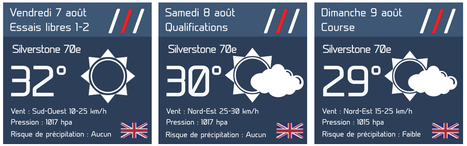 La course du 70e anniversaire (rappelons que la première course du championnat de Formule 1 a eu lieu sur ce même circuit le 13 mai 1950) devrait se dérouler sous un ciel majoritairement ensoleillé et avec de chaudes températures pour cette région du centre de l’Angleterre.