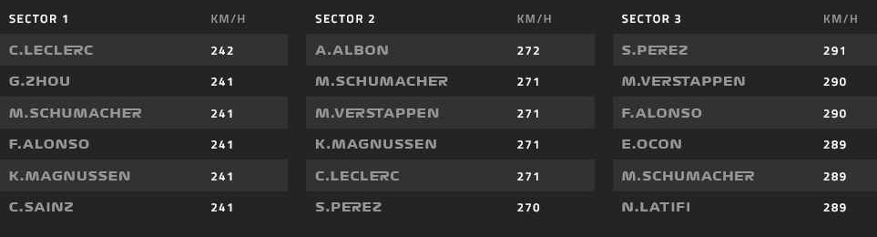 Si l’on regarde un peu plus en détail les vitesses de pointe enregistrées ce samedi lors des qualifications dans les trois secteurs du tracé de Sakhir, il est vrai que les deux Mercedes W13 pilotées par Hamilton et Russell brillent par leur absence dans ce classement (voir ci-dessous).
