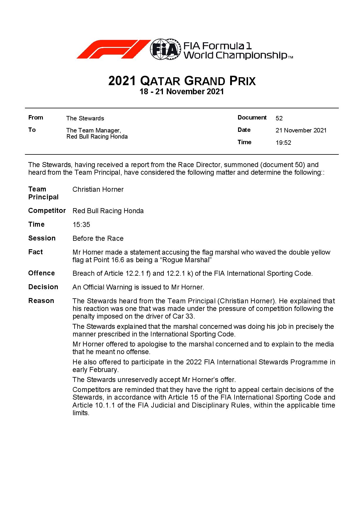 Le patron de l’équipe Red Bull a proposé de s’excuser auprès du commissaire et d’expliquer aux médias qu’il ne voulait pas l’offenser. Horner a également accepté de participer au programme international des commissaires sportifs de la FIA 2022 en février prochain. Il a également reçu une réprimande de la part de la FIA.