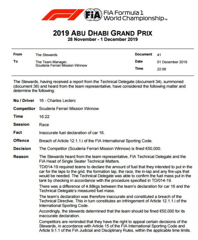 Les commissaires de course de la FIA ont constaté une différence de plus de 4 kilos entre ce qui a été déclaré par Ferrari avant la course et ce qui a été contrôlé par les commissaires eux-mêmes.