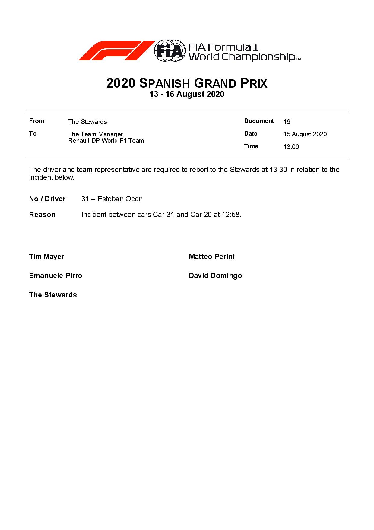 Les deux hommes sont donc convoqués auprès des commissaires pour donner leur version des faits, alors que la Renault RS20 d’Ocon a tapé assez fort le mur à la suite de cet incident, ce qui va obliger son équipe à procéder aux réparations avant les qualifications programmées à 15h00 (heure de Paris).