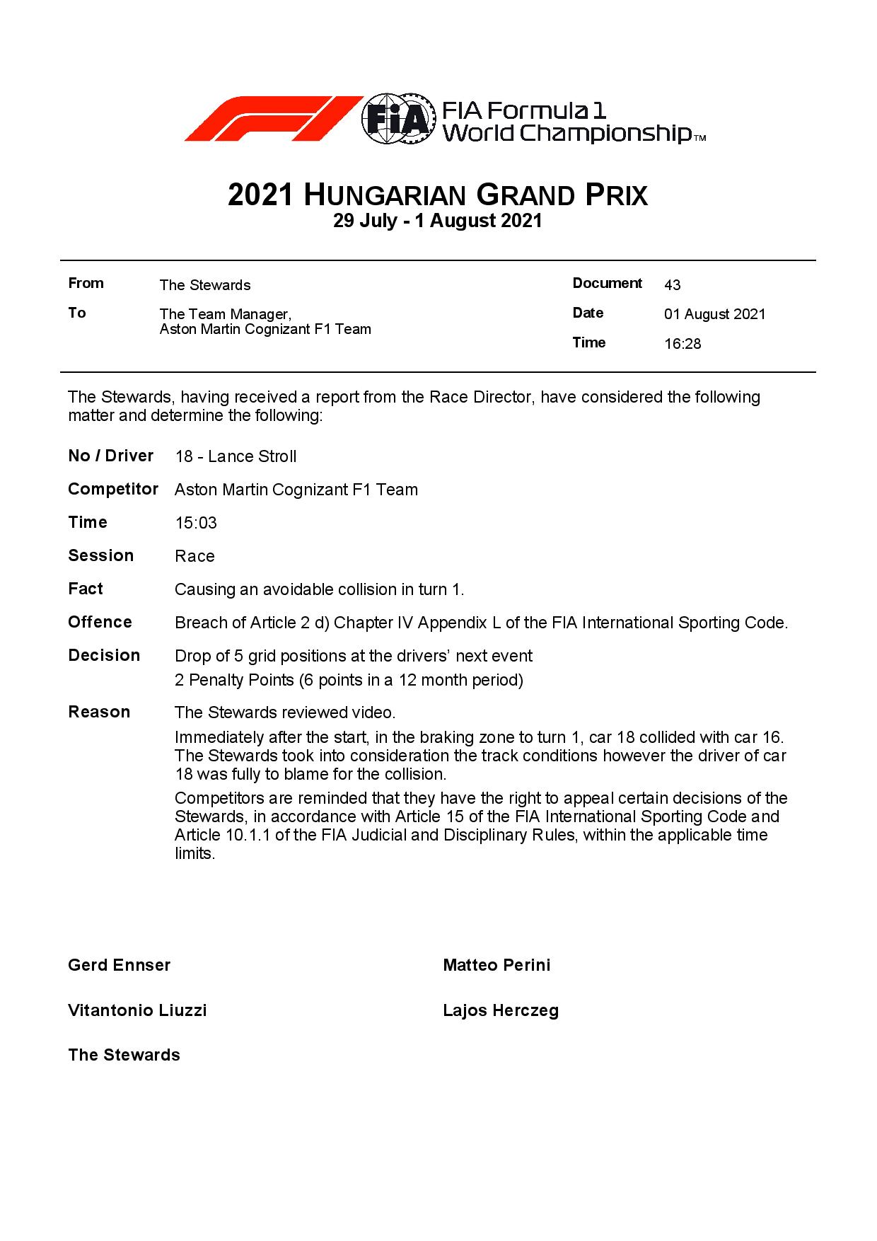 Les commissaires de course du Grand Prix de Hongrie ont donc décidé d’infliger une pénalité de cinq places à Lance Stroll sur la grille de départ de la prochaine manche de la saison qui se disputera le 28 août sur le circuit de Spa-Francorchamps en Belgique. Le pilote Aston Martin a également écopé de deux points de pénalité sur sa super licence.