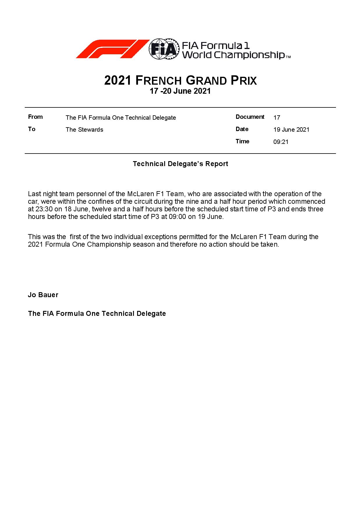 « Il s’agissait de la première des deux exceptions individuelles autorisées pour l’équipe McLaren F1 lors de la saison du championnat de Formule 1 2021 et aucune mesure ne devrait donc être prise. »