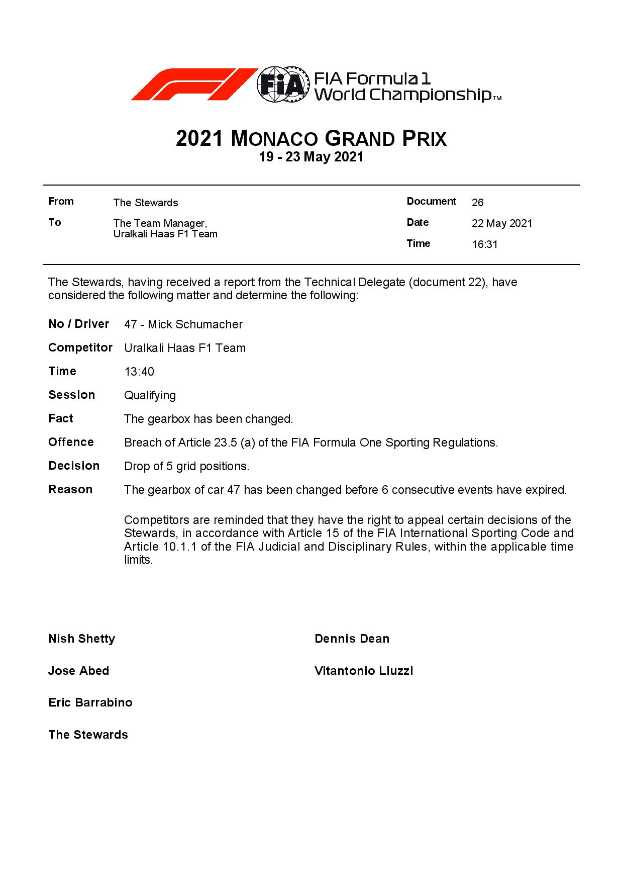 Le pilote de l’équipe Haas Mick Schumacher a écopé ce samedi d’une pénalité sur la grille de départ du Grand Prix de Monaco en raison d’un changement de boîte de vitesses sur sa monoplace.