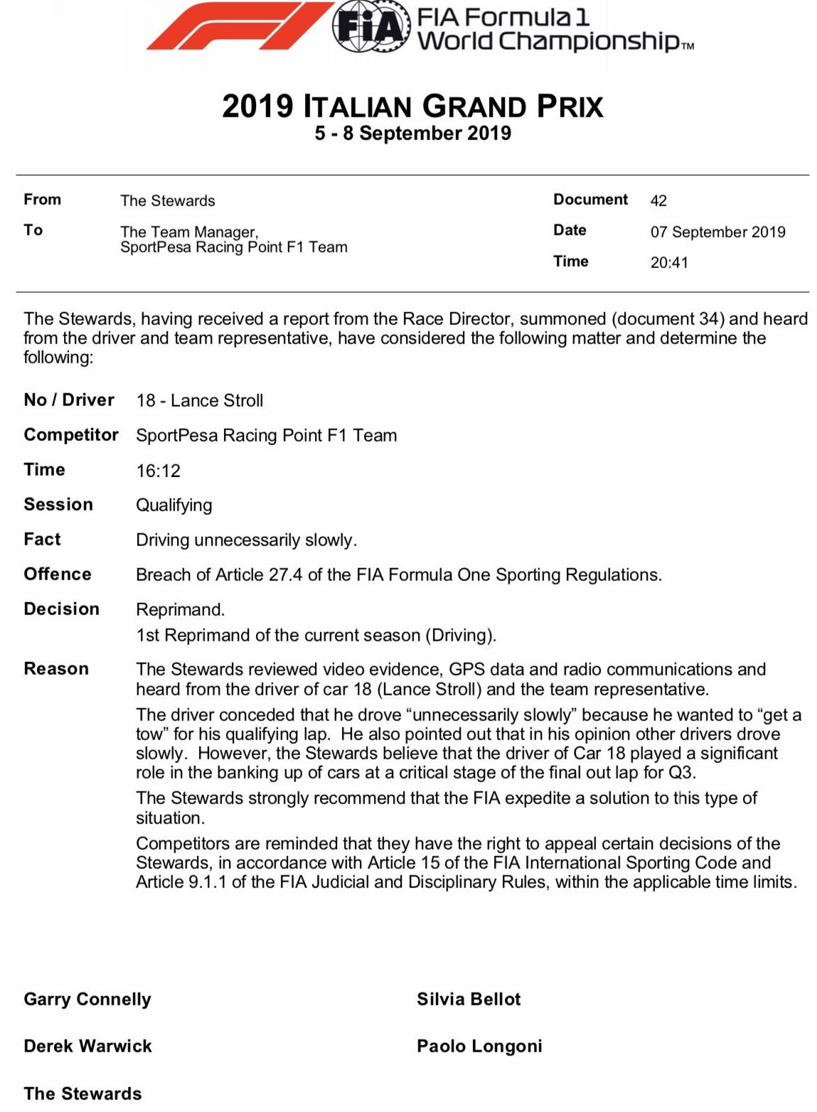 Les trois pilotes étaient convoqués chez les commissaires de course du Grand Prix d’Italie pour avoir roulé trop lentement lors de la dernière phase des qualifications.