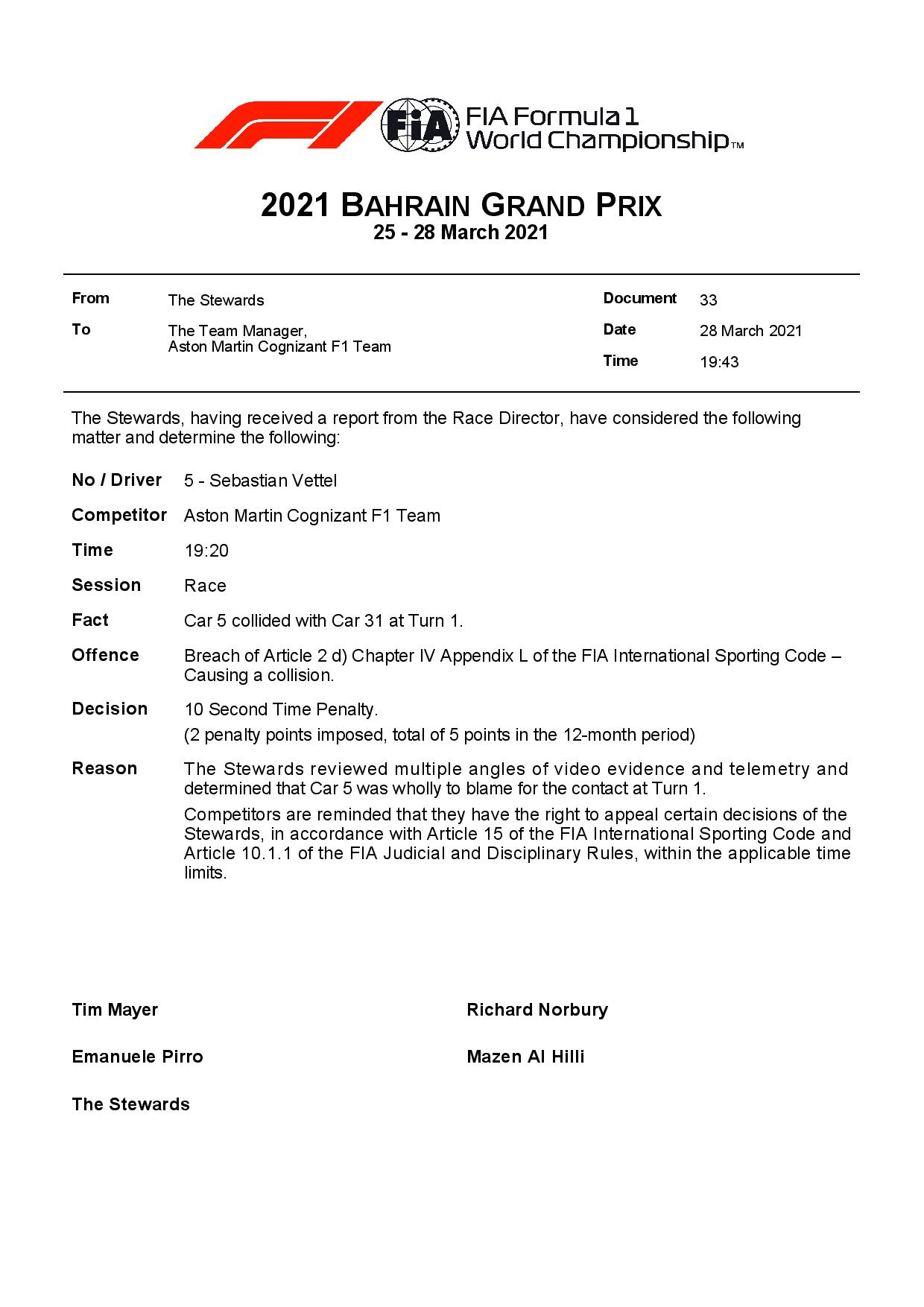 Le pilote Aston Martin Sebastian Vettel a écopé d’une pénalité de temps à l’arrivée du Grand Prix de Bahreïn pour avoir percuté l’Alpine du Français Esteban Ocon au premier virage en course.