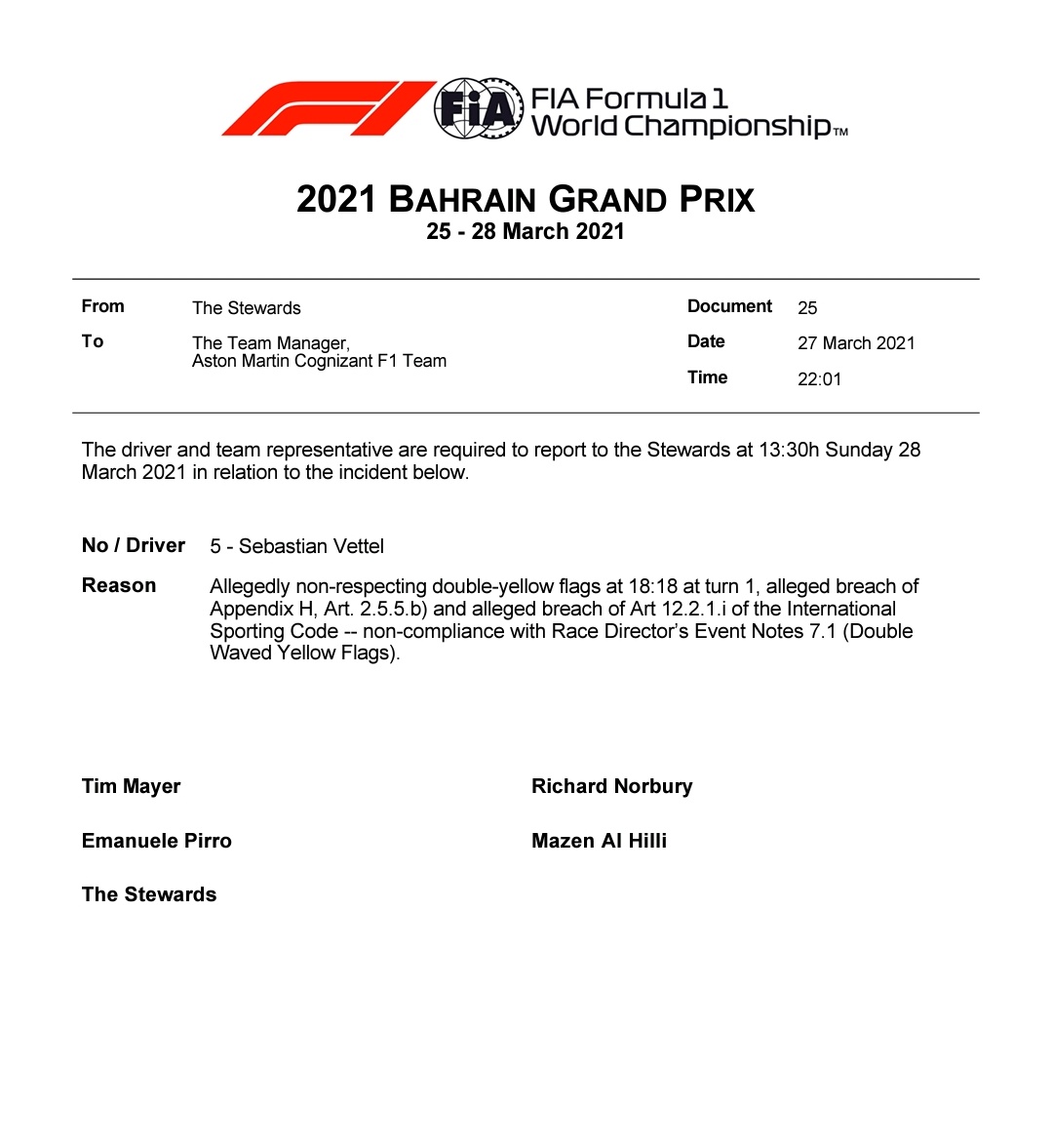 Sebastian Vettel a été convoqué chez les commissaires de course ce dimanche 28 mars avant le départ du Grand Prix de Bahreïn, première manche de la saison 2021 de Formule 1.
