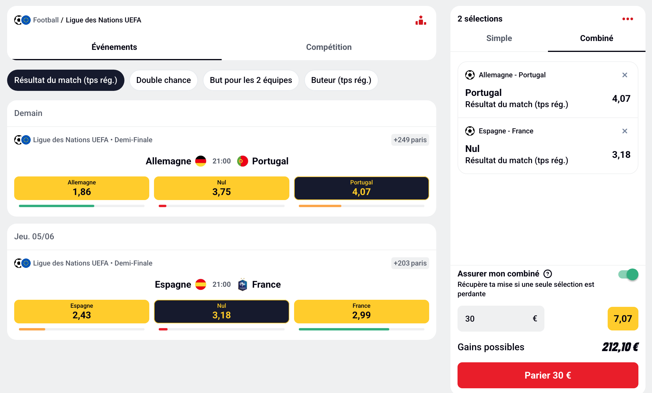 - Paris multiples, ou combinés : faites vos jeux parmi plusieurs résultats sur une rencontre, ou plusieurs résultats de plusieurs rencontres