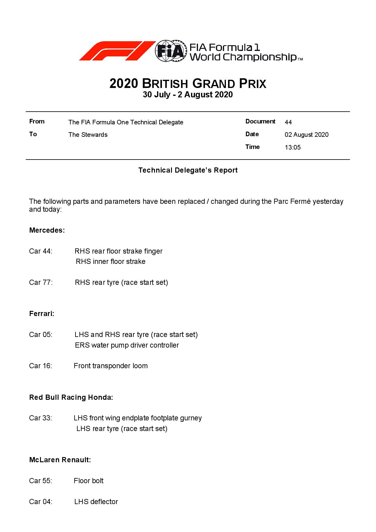 Voici la liste des pièces changées ou modifiées sous le régime du parc fermé entre la fin des qualifications de samedi et le départ du Grand Prix de Grande-Bretagne ce dimanche.