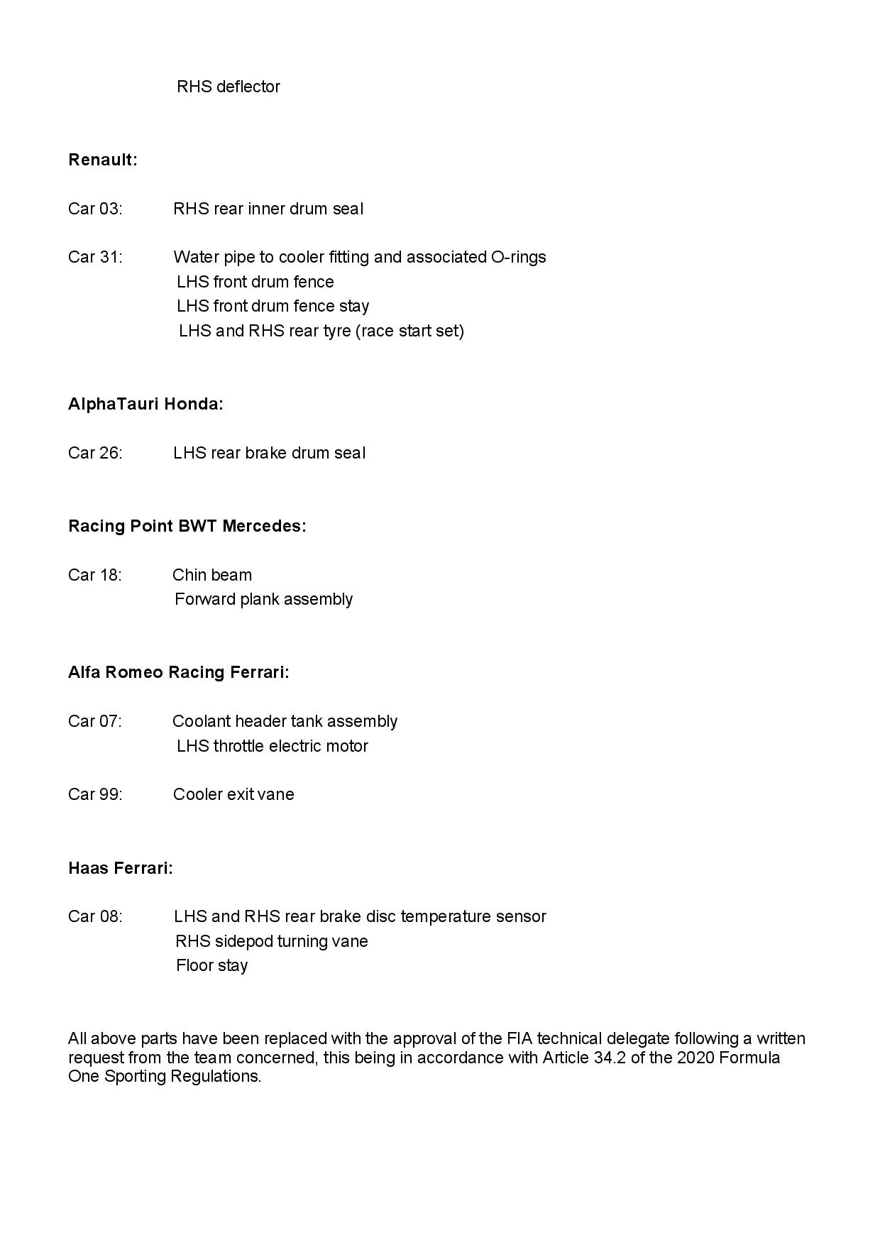 On apprend de ce document que Ferrari a procédé au changement du contrôleur de pompe à eau sur la monoplace de Sebastian Vettel ou encore des conduites d’eau sur la Renault d’Esteban Ocon, ainsi que les joints toriques associés, ce qui laisse penser que Renault n’a peut-être réglé définitivement ses problèmes de refroidissement sur la RS20.