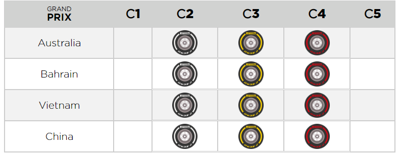 Pour les quatre premières manches en Australie, à Bahreïn, en Chine et au Vietnam, Pirelli a décidé de proposer aux équipes les gommes C2, C3 et C4 de sa gamme.