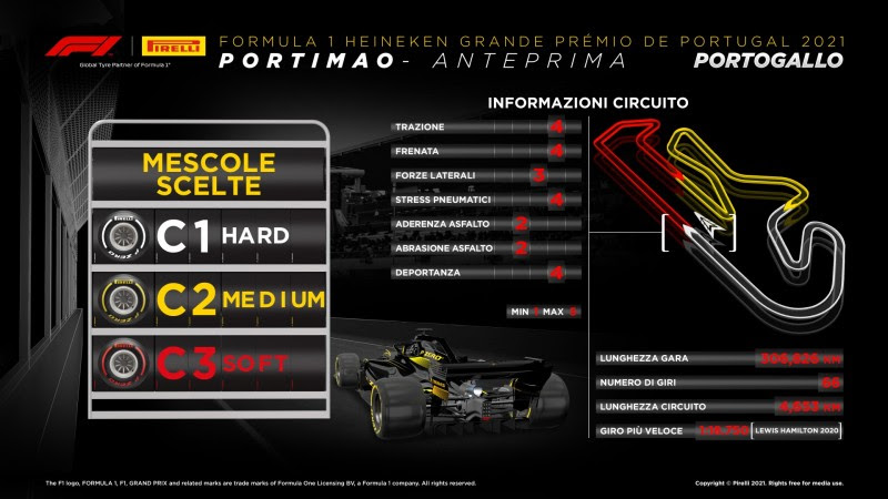 Après deux courses consécutives à Bahreïn et en Italie avec la même nomination (C2, C3 et C4), Pirelli a choisi pour le Grand Prix du Portugal les C1, C2 et C3.