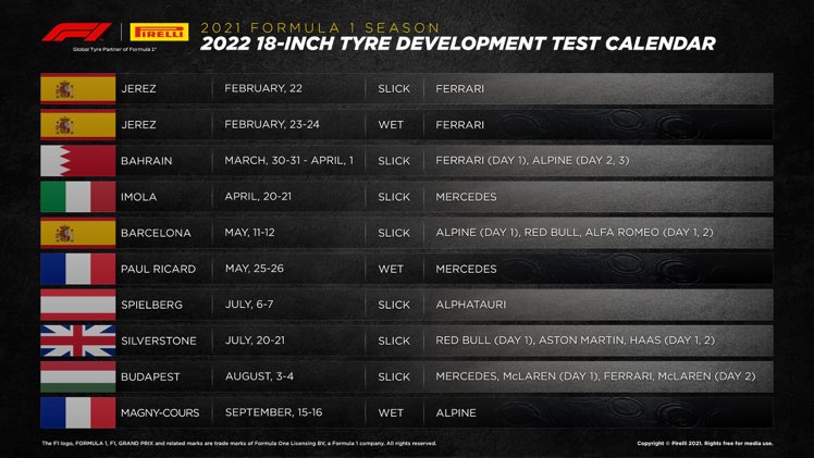 Pirelli a prévu 10 sessions de tests de développement cette année, pour un total de 28 jours, avec neuf équipes de Formule 1 avant la saison 2022, au cours de laquelle seront introduits de nouveaux règlements techniques, y compris le passage aux pneus 18 pouces.