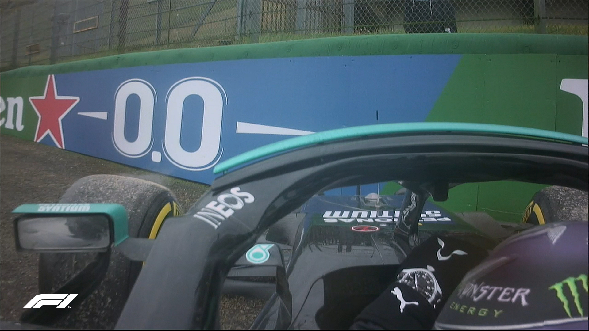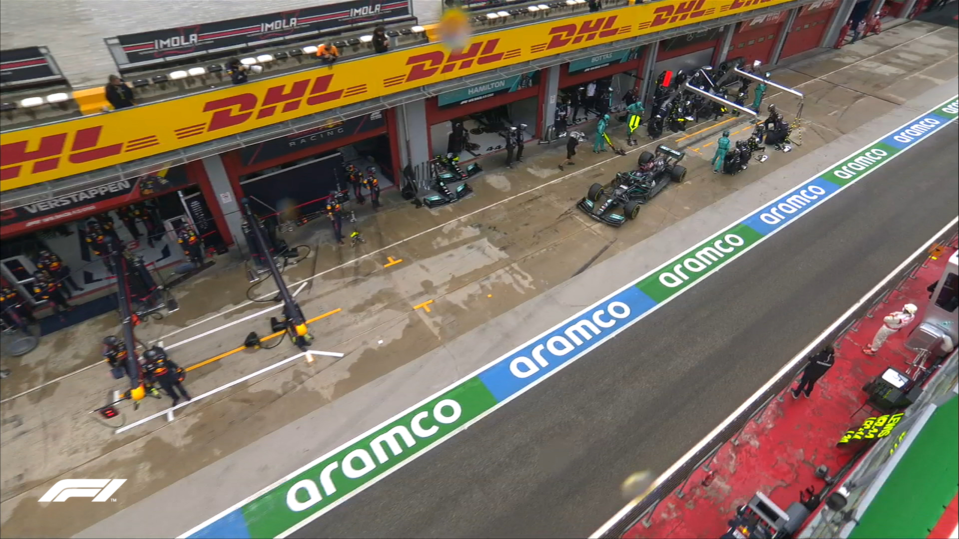 Après plusieurs tours à chasser la Red Bull de Verstappen sur une piste encore partiellement humide, le pilote Mercedes est rentré au stand pour chausser des pneus Slicks sur sa monoplace un tour après Max Verstappen.
