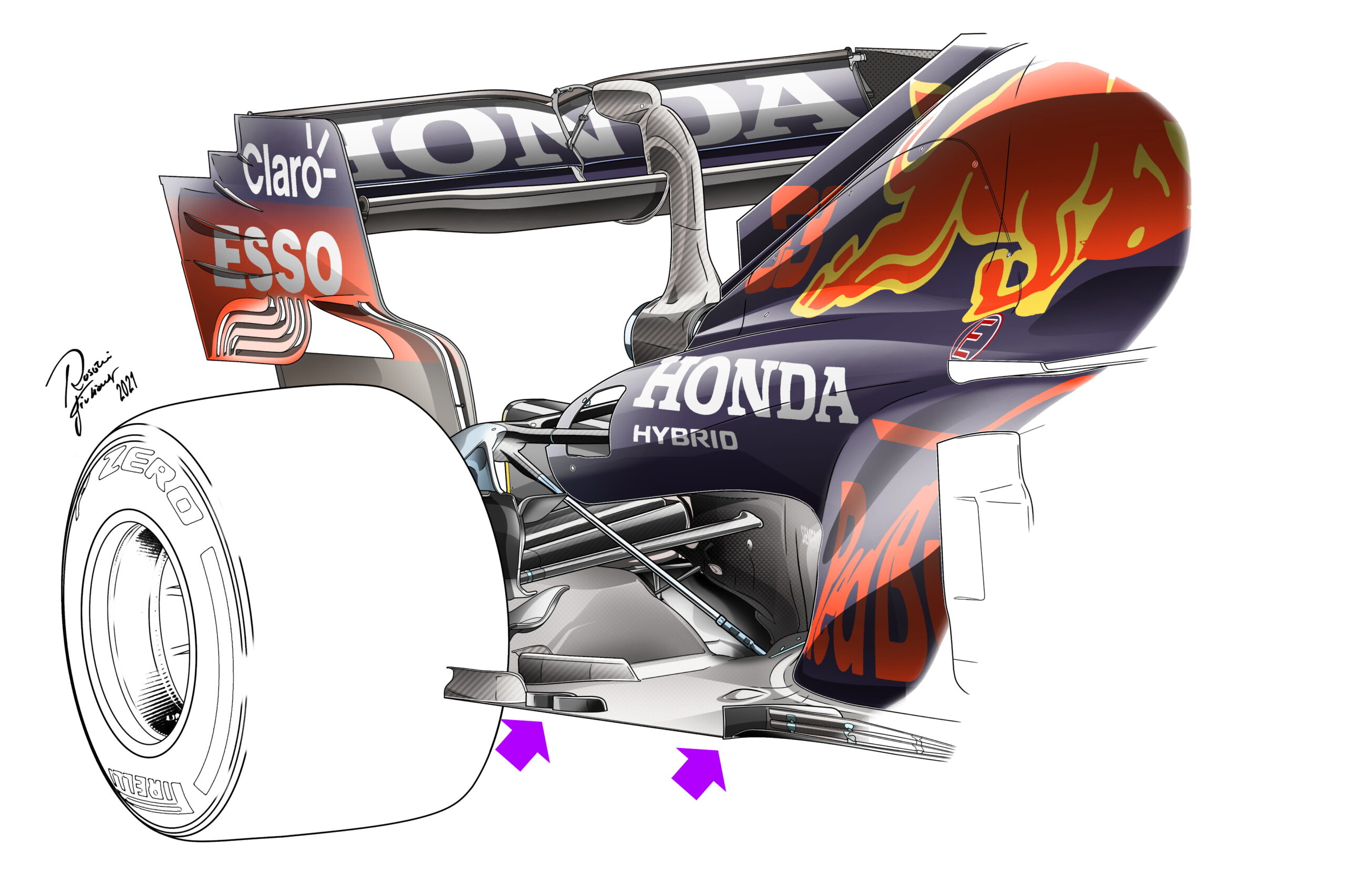 Red Bull a donc peut-être perdu moins en pourcentage d’appuis qu’en 2020, en raison d’un fonctionnement différent du diffuseur, alors que la nouvelle réglementation a limité la hauteur maximale des ailettes internes dans le canal d’extraction, qui sont plus courtes cette année de 50 mm par rapport au plan de référence.