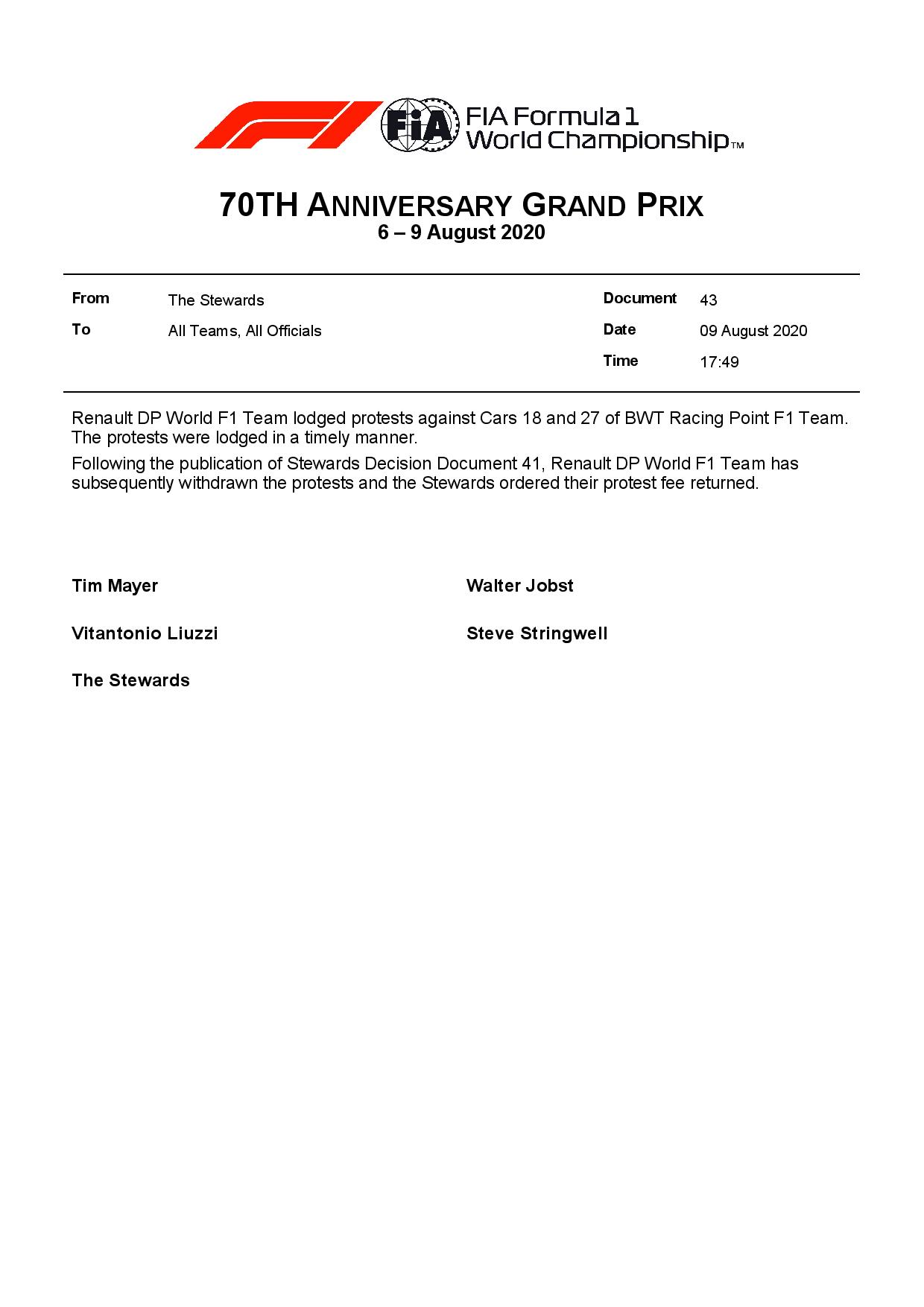 L’équipe a écopé d’une simple réprimande pour avoir utilisé ces écopes de freins, et en parallèle, ayant eu connaissance de l’enquête menée par la FIA sur Racing Point, l’équipe du constructeur français a donc pris la décision de retirer sa protestation déposée quelques minutes avant.