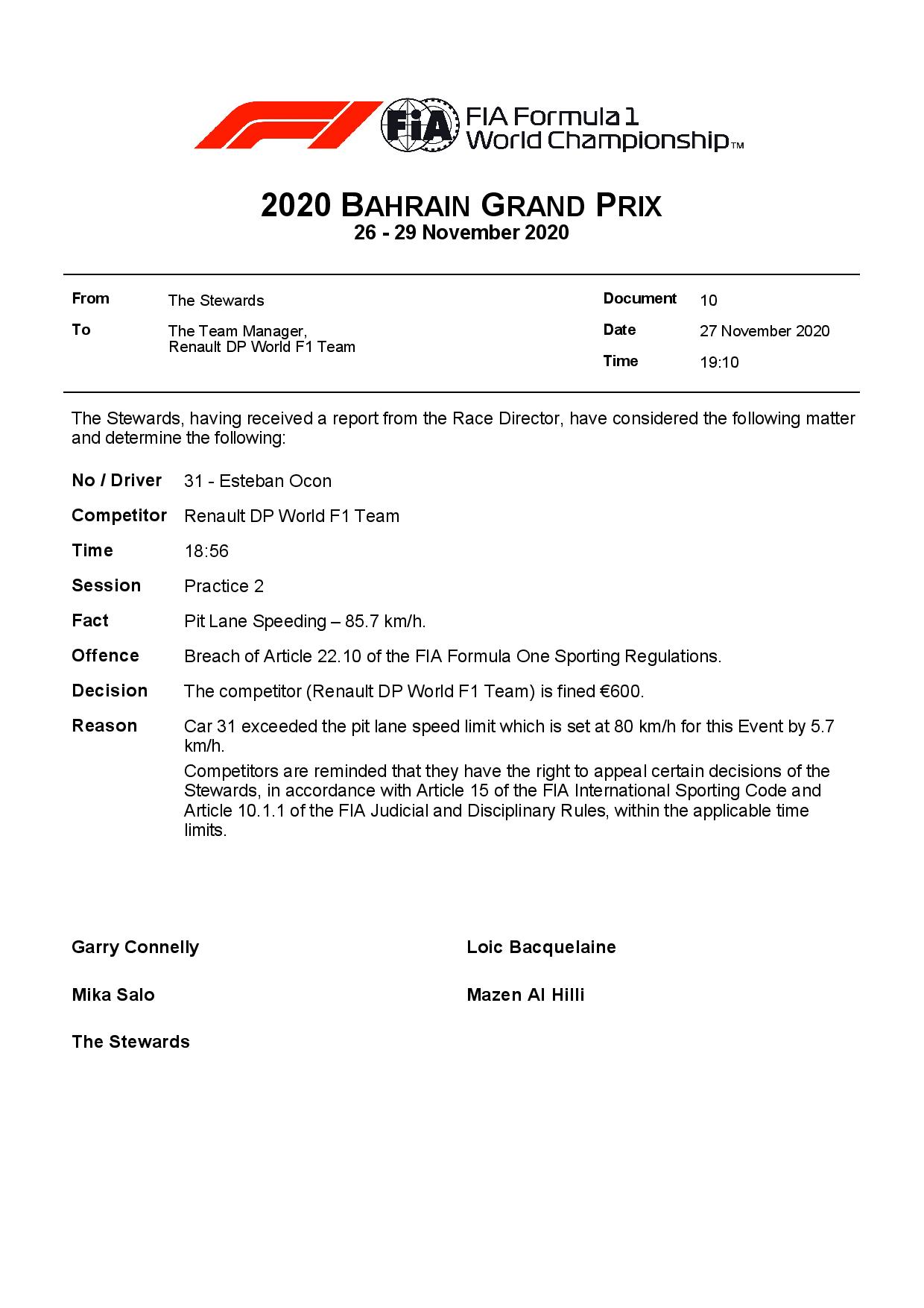 Sur le tracé de Sakhir, et pour toute la durée de l’évènement, la vitesse dans la voie des stands a été fixée à 80 km/h. Esteban Ocon pour sa part a été flashé par le radar à 85,7 km/h, soit 5,7 km/h au dessus de la limite.